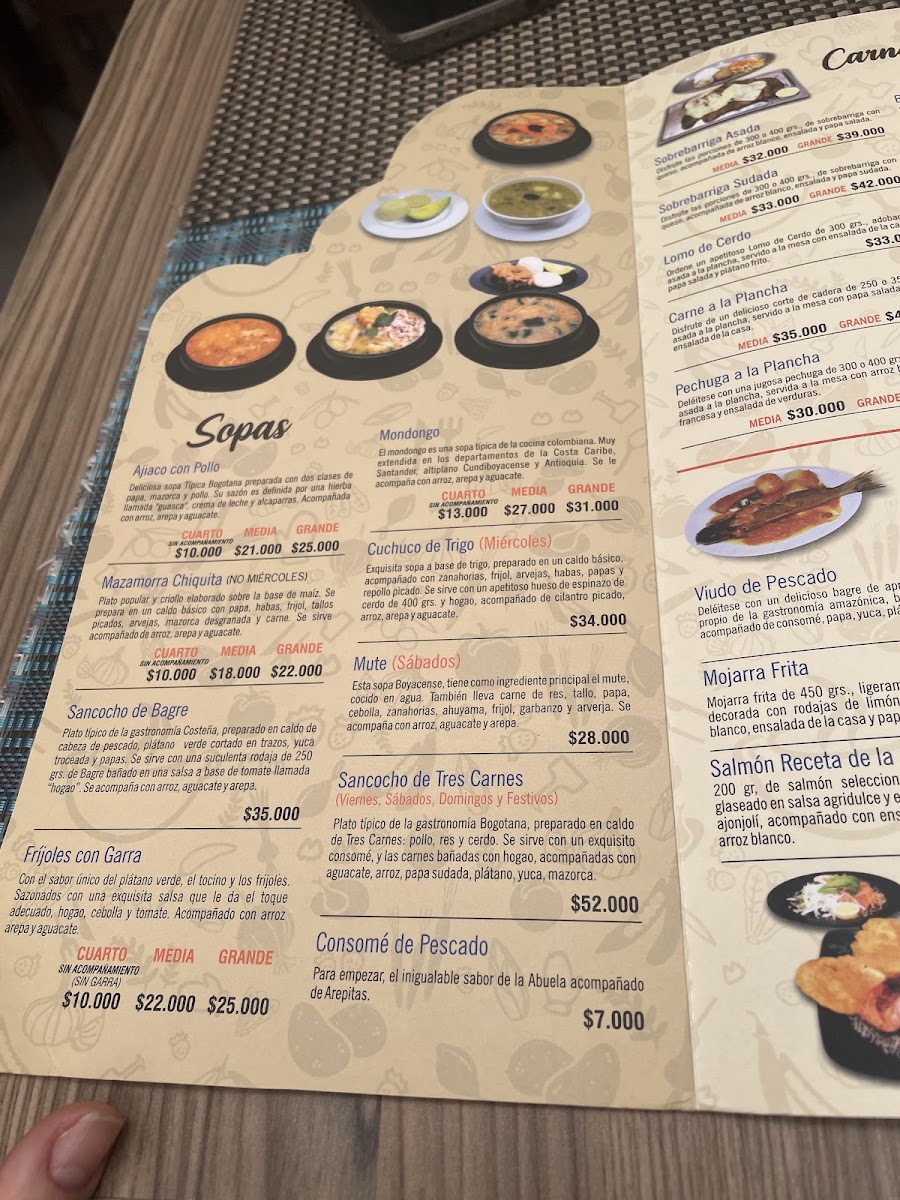 Located in the heart of Bogotá, Las Cazuelas de la Abuela offers a delightful culinary experience steeped in tradition. This eatery shines with its hearty soups and stews, most notably the famous ajiaco con pollo, a rich chicken soup served with avocado, rice, and a scrumptious arepa, all for a reasonable price of 20k pesos. Diners rave about the clean, spacious setting, where a warm ambiance pairs with attentive service.